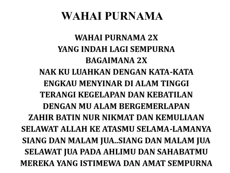 Lirik Lagu Lesti - Purnama. WAHAI PURNAMA WAHAI PURNAMA YANG INDAH LAGI SEMPURNA BAGAIMANA BAGAIMANA NAK KU LUAH DENGAN KATA-KATA ENGKAU MENYINAR DI ALAM TINGGI DI ALAM TINGGI TERANGI KEGELAPAN DAN KEBATILAN DENGAN MU ALAM BERGEMERLAPAN BERGEMERLAPAN ZAHIR BATIN DENGAN NUR NIKMAT DAN KEMULIAAN SELAWAT ALLAH. July 27 2018 Post a Comment Purnama - Lesti.